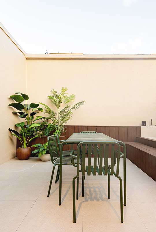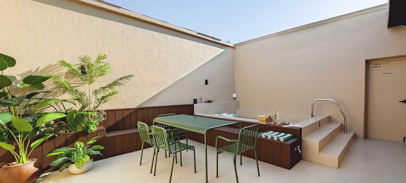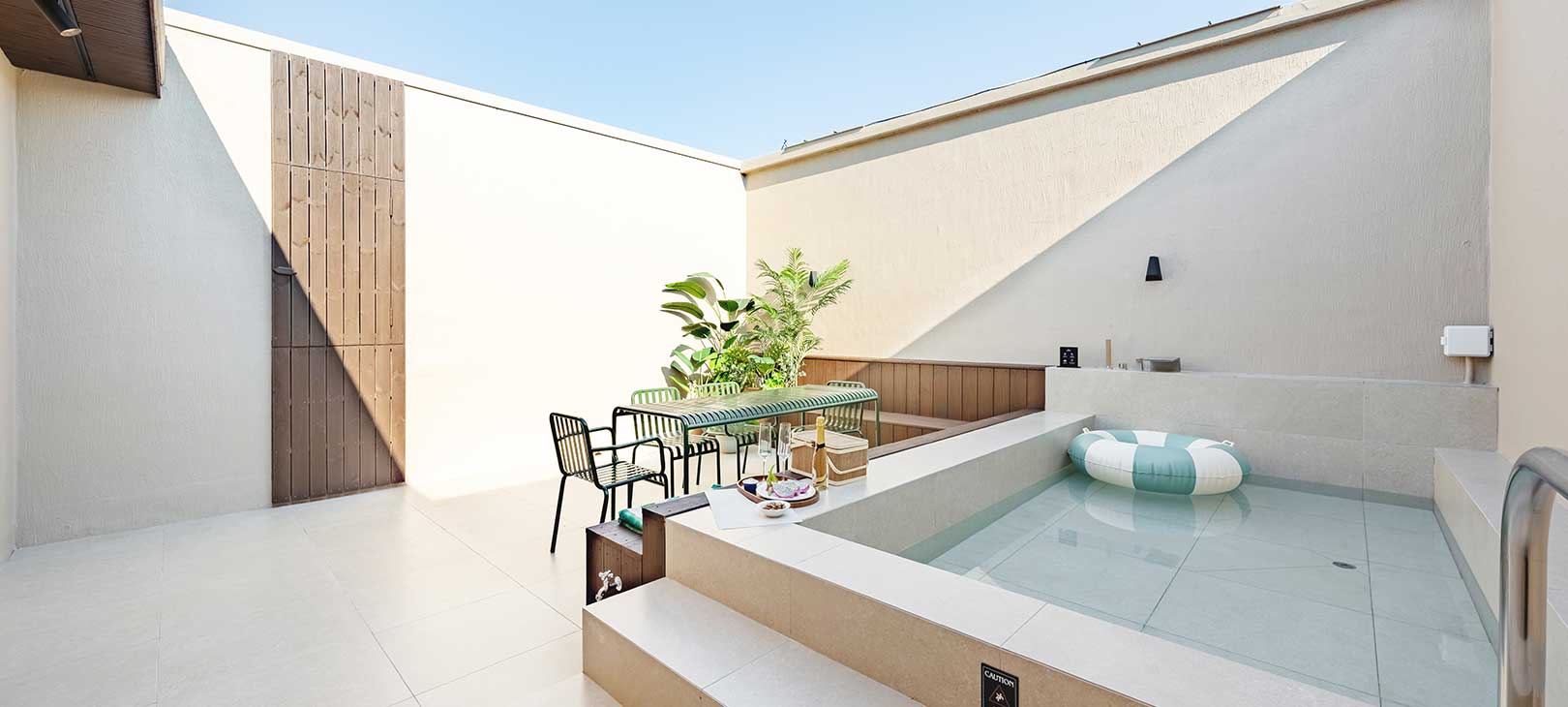 밤이 되면 아이보리 타일과 초록 식물이 어우러진 야외 자쿠지가 그날의 피로를 씻어냅니다.