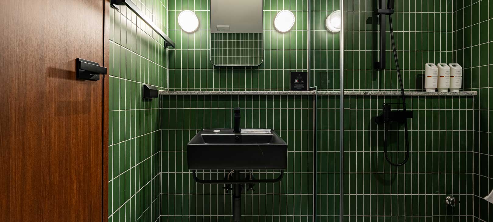 복층 구조로 설계된 객실은 1층에 스크린 침실과 모자이크 타일 욕실, 2층엔 오픈형 키친과 평상이 이어집니다.
