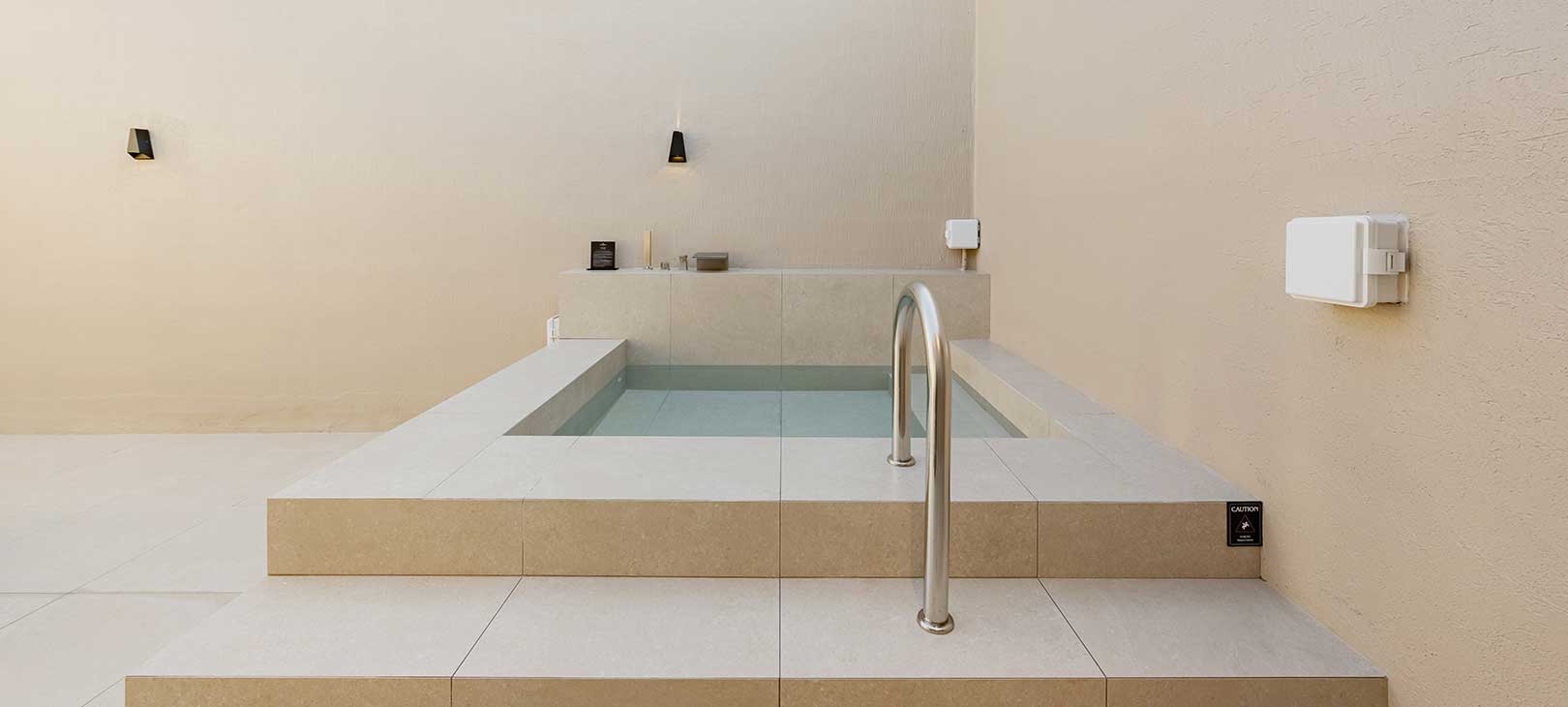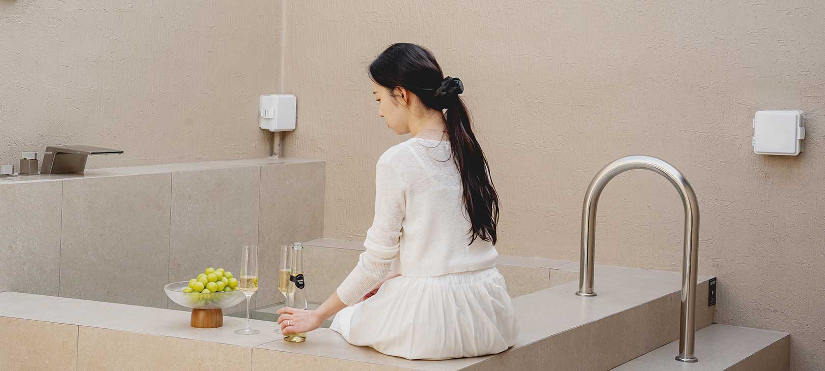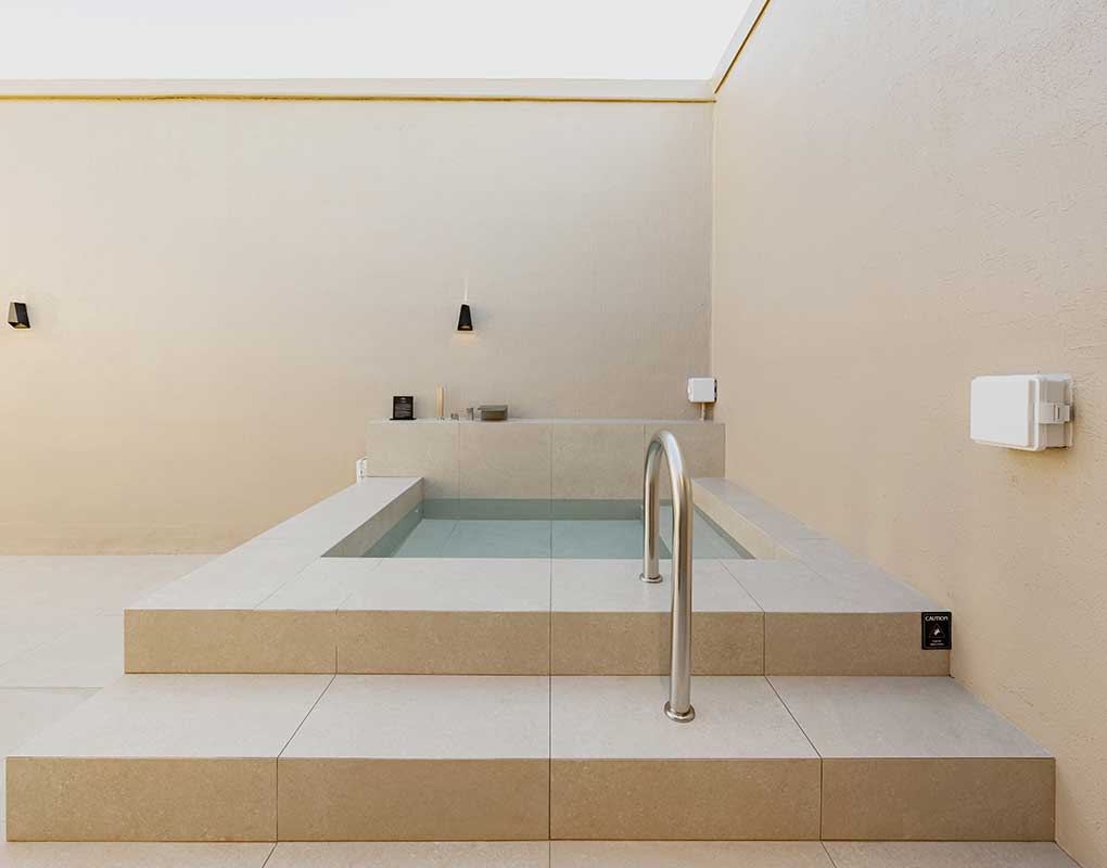 기록 책상 위에는 여행의 마음을 남길 여백이 있고, 문을 열면 이어지는 야외 자쿠지에서는
