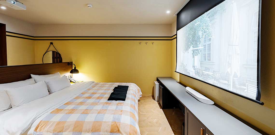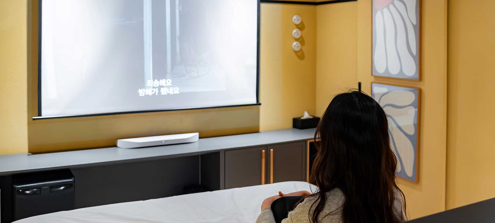 침실에는 TV 대신 빔프로젝터 스크린이 설치되어 빛보다 따뜻한 영화의 장면으로 밤을 채웁니다.