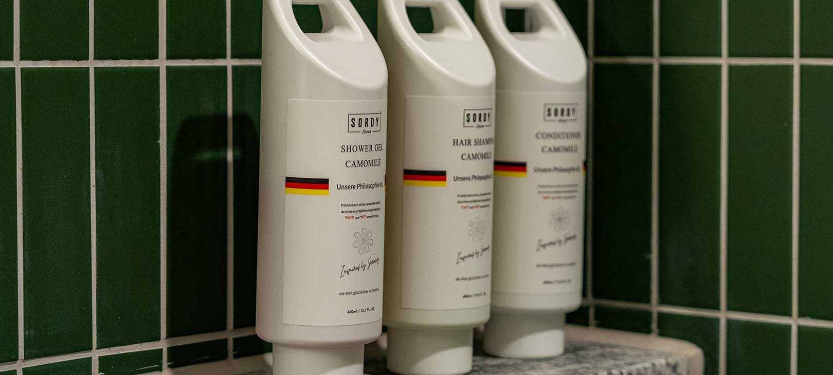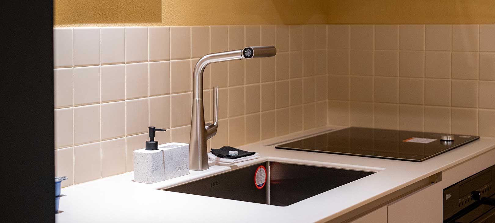 노란빛 공간과 대비되는 그린 타일 욕실은 이 객실만의 반전 매력입니다.