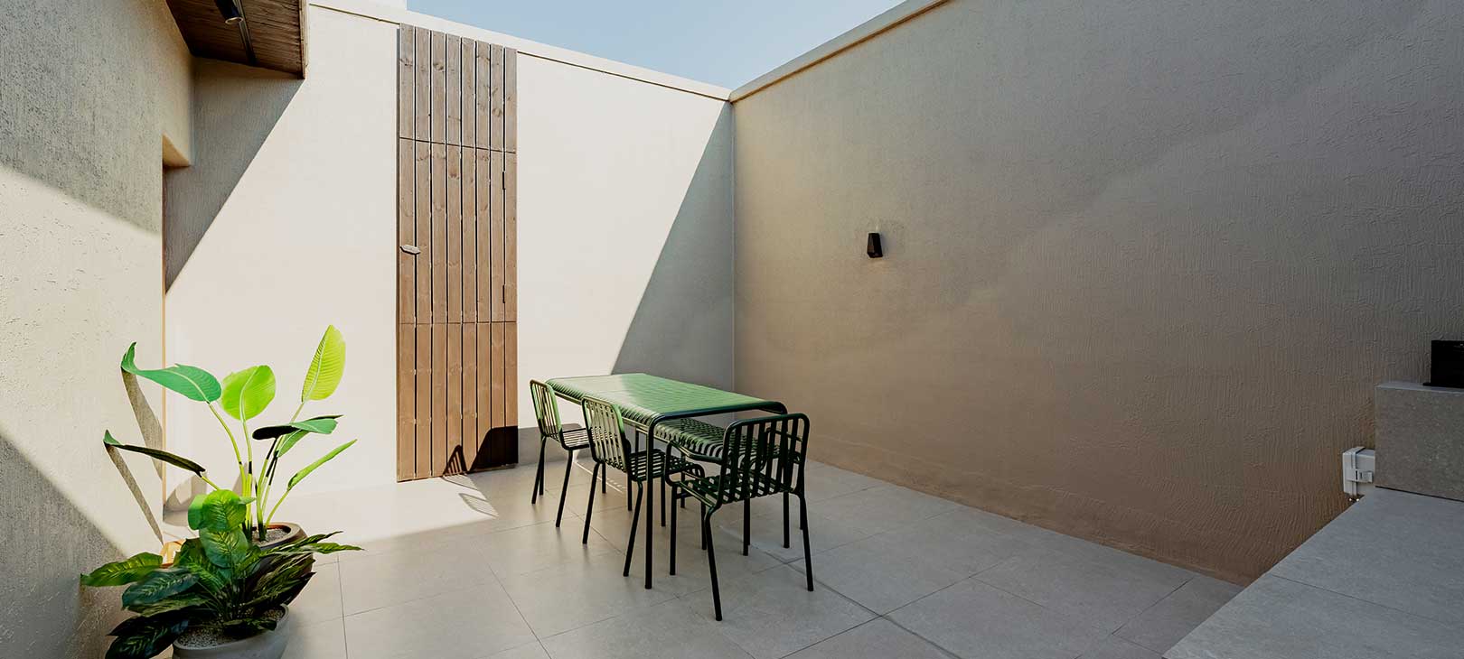 초록의 식물과 아이보리빛 타일이 지중해의 밤을 연상시킵니다.