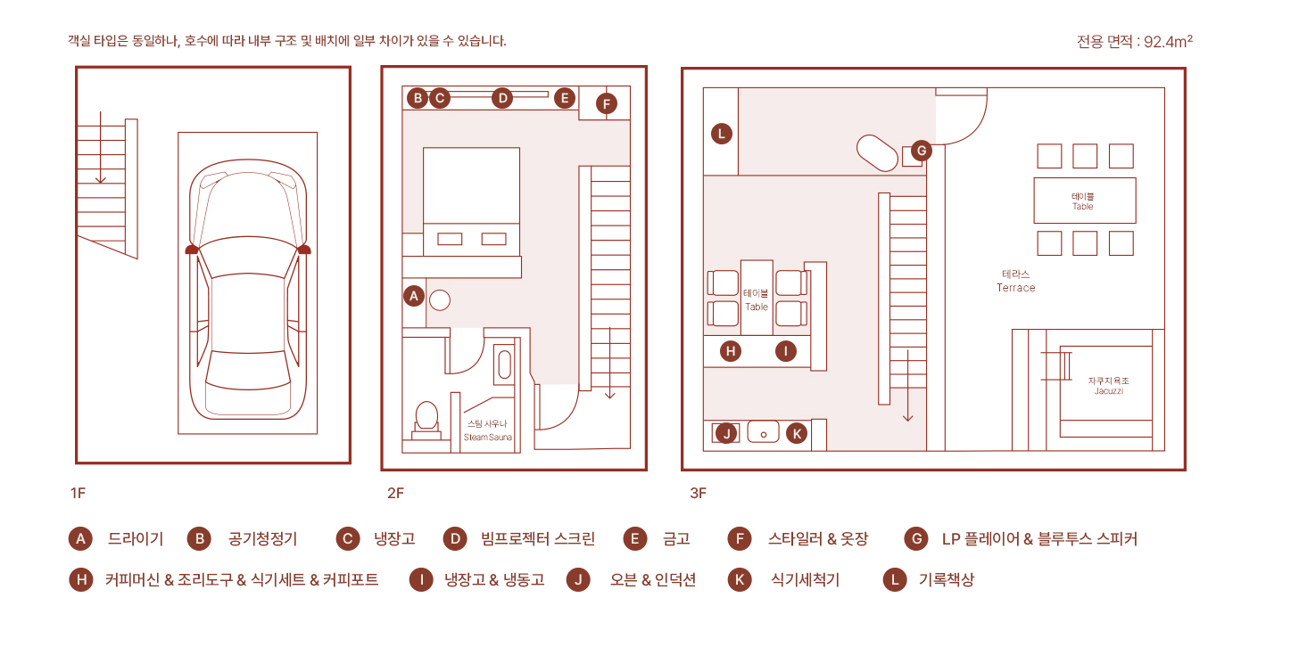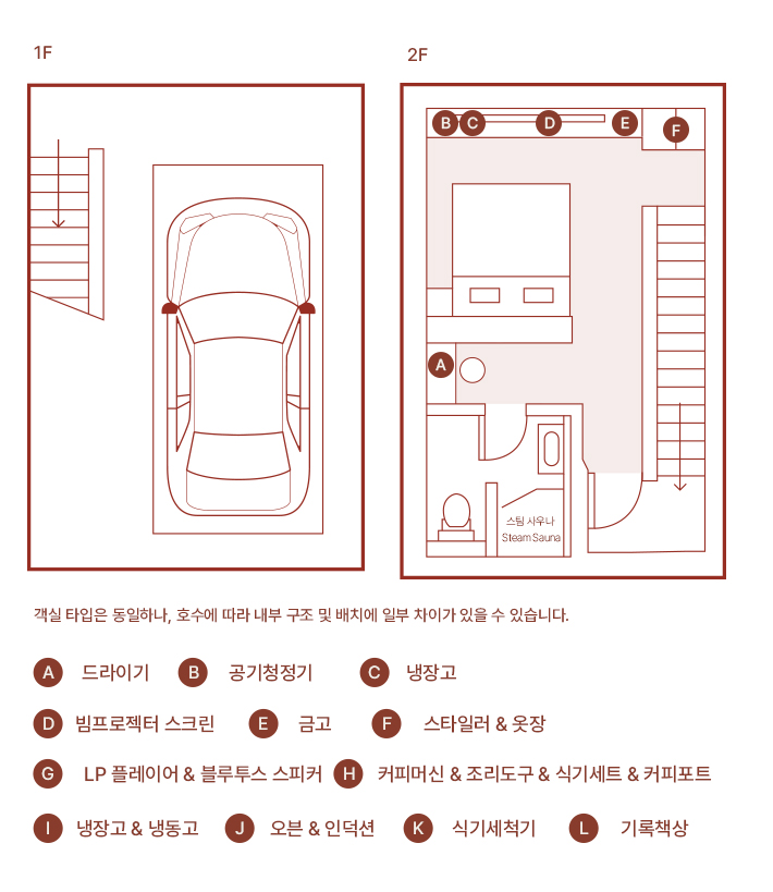 복층 구조로 설계된 객실은 1층에서는 숙면을 위한 고요한 침실이, 2층에서는 생활과 여유가 어우러집니다.