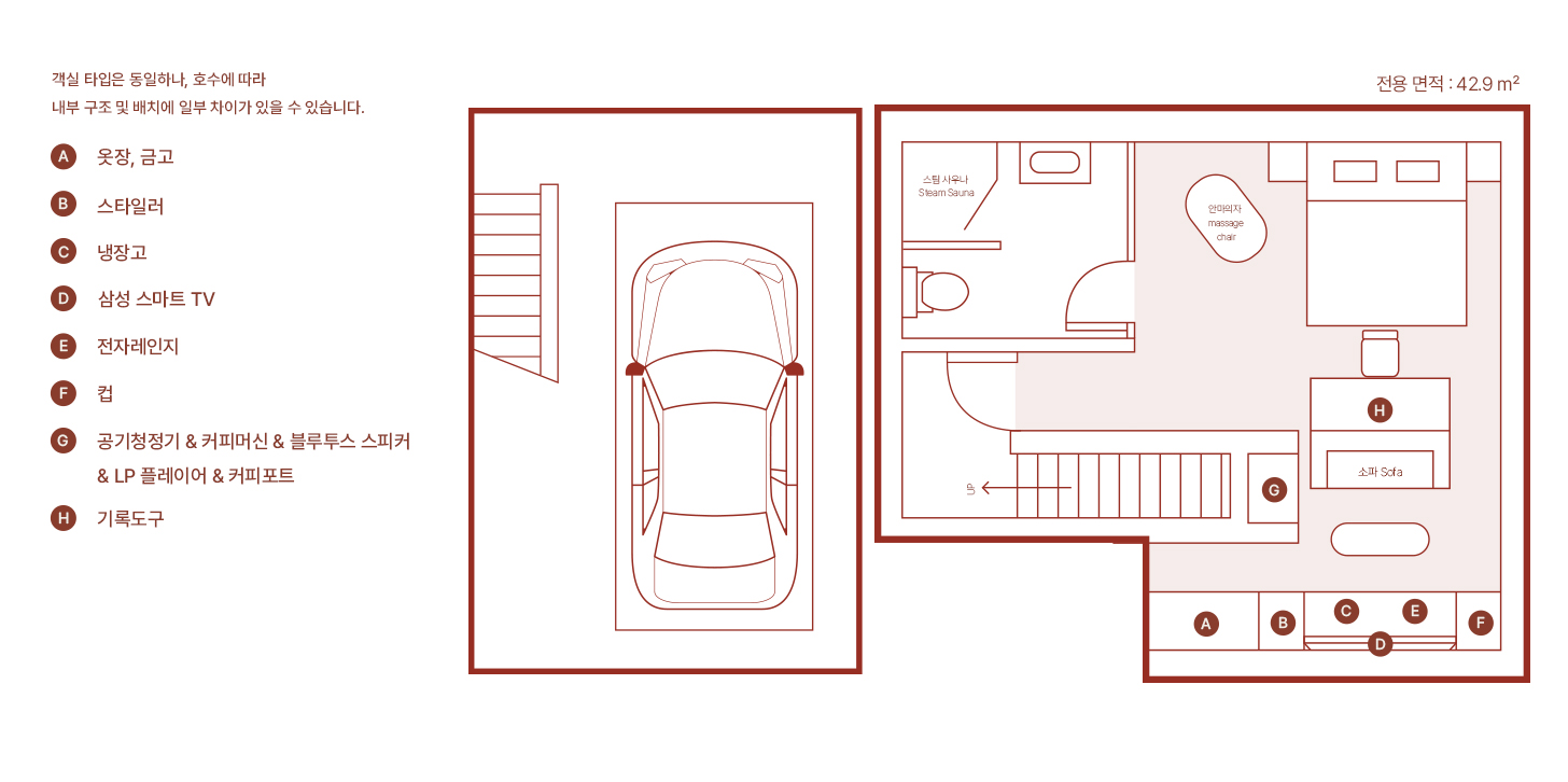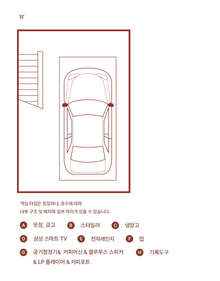 프라이빗한 차고형 구조로 주차 후 바로 객실로 들어오는 길, 그 순간부터 세상과의 거리가 한층 멀어집니다.