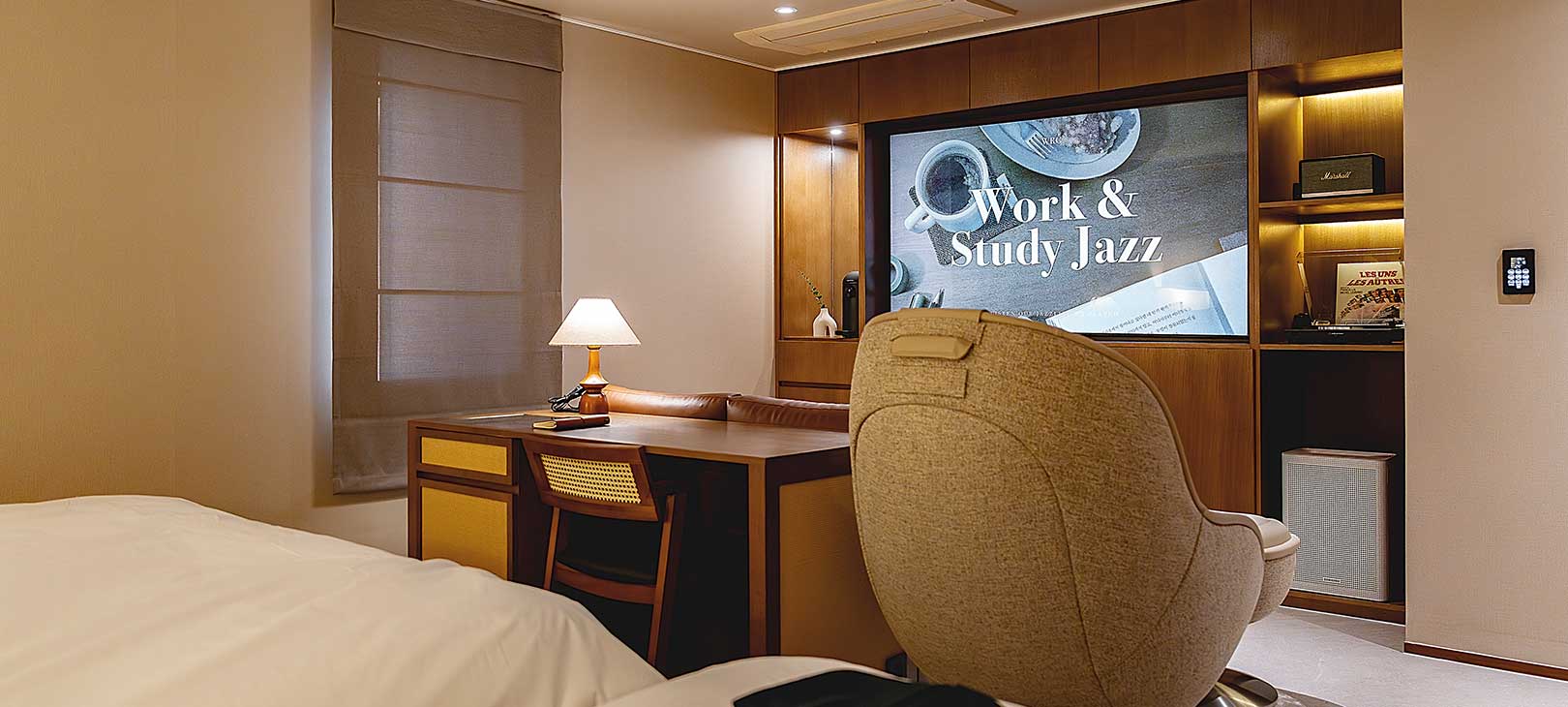 마샬 스피커와 LP 플레이어, 스팀 사우나가 준비되어 있어 음악과 온기로 하루의 긴장을 천천히 녹일 수 있습니다.