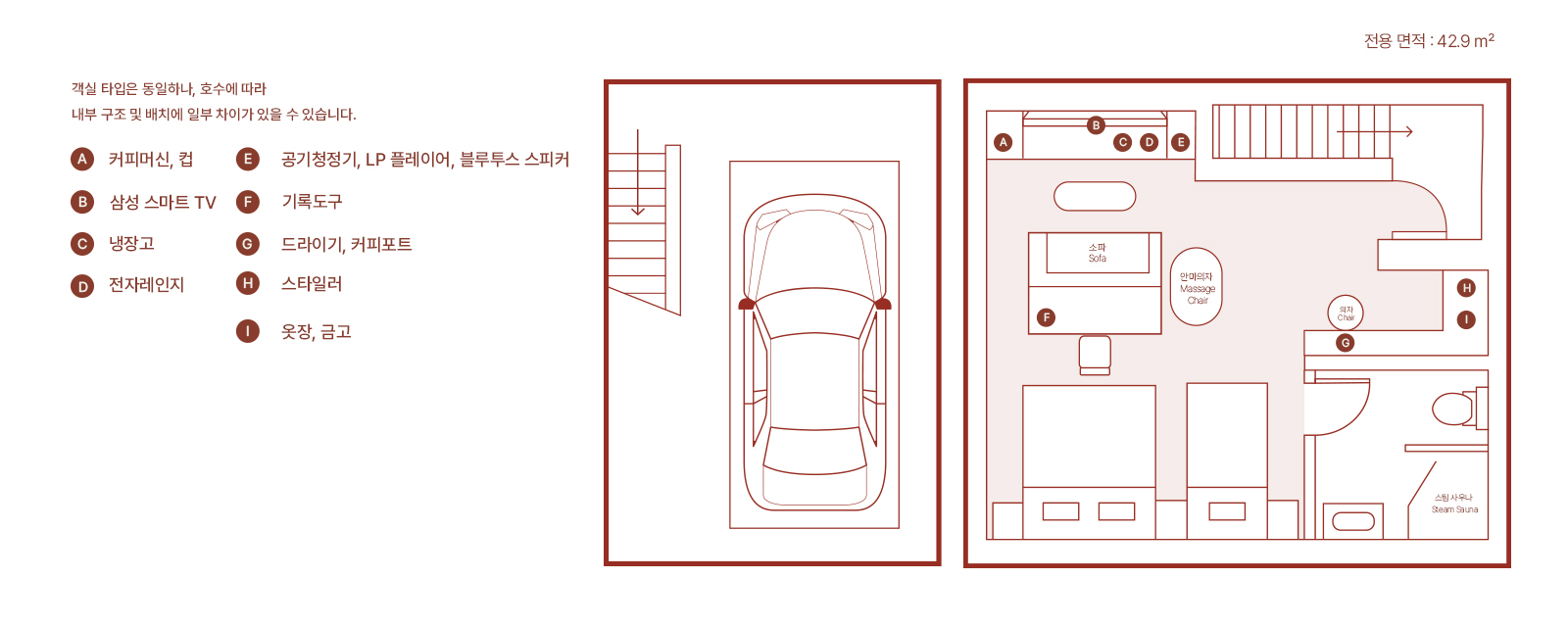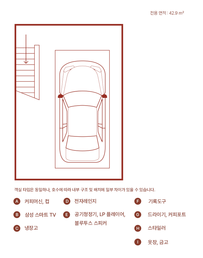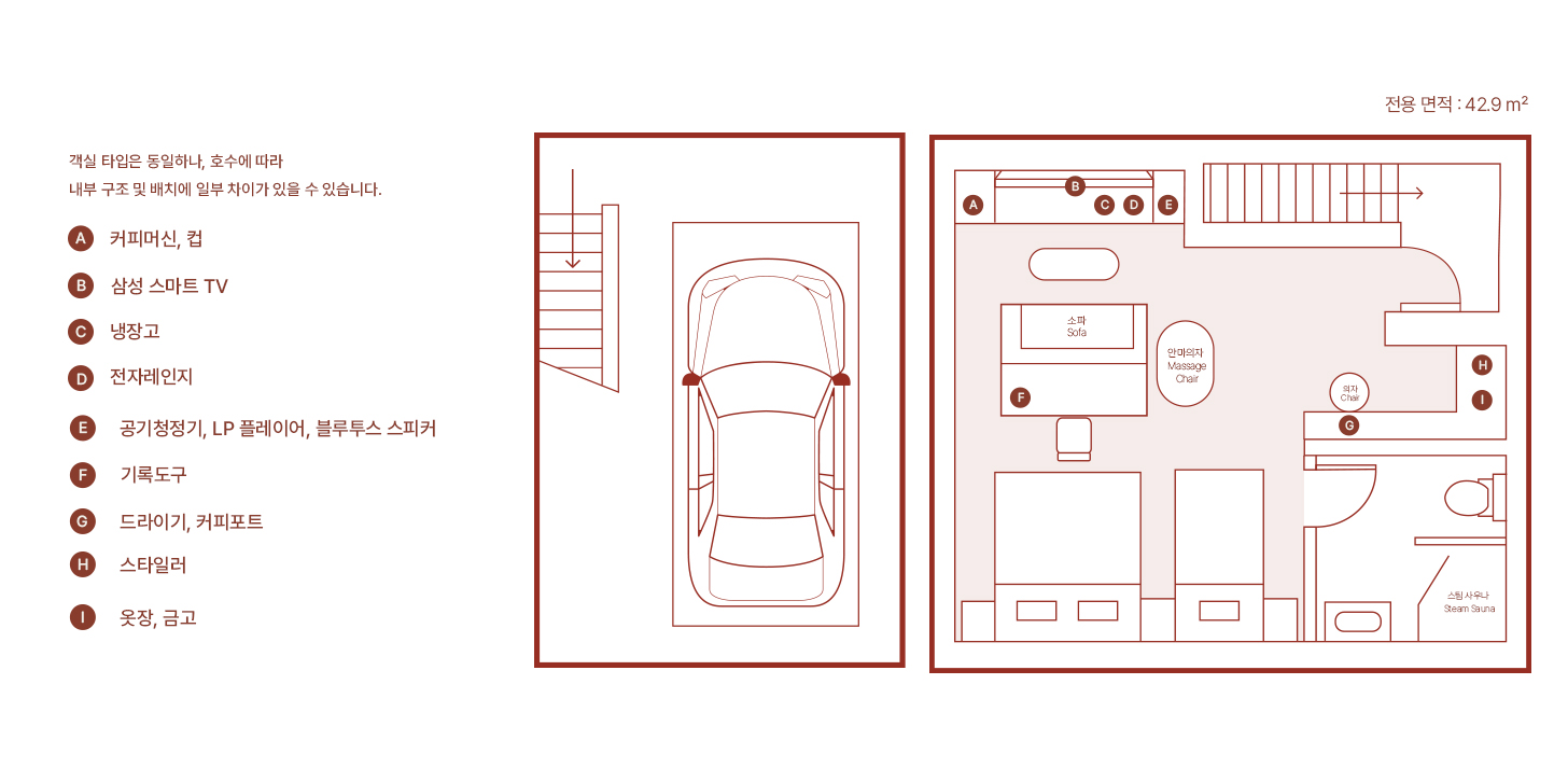 프라이빗한 차고형 구조로 주차 후 바로 객실로 이어지는 동선은 하루의 피로를 방 안으로 들이지 않게 해줍니다.