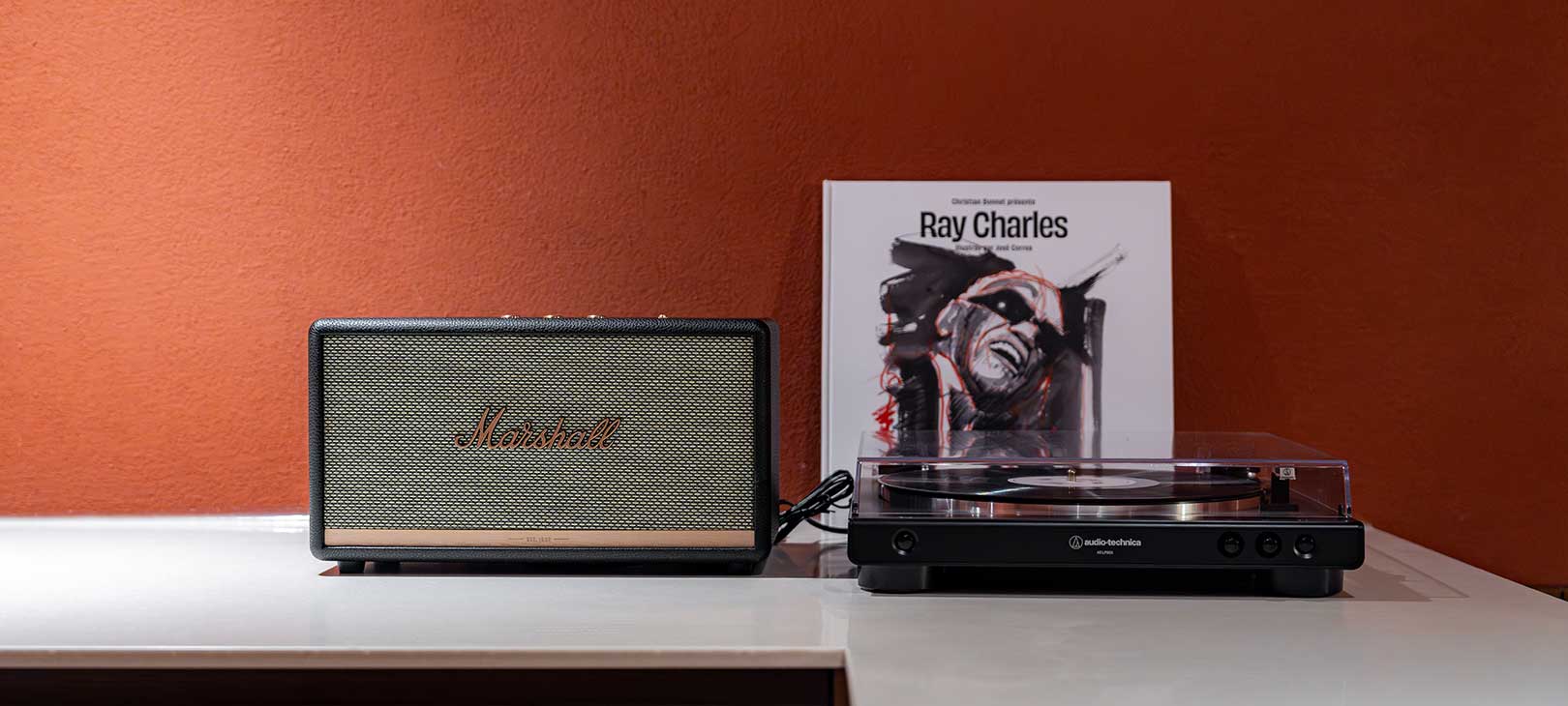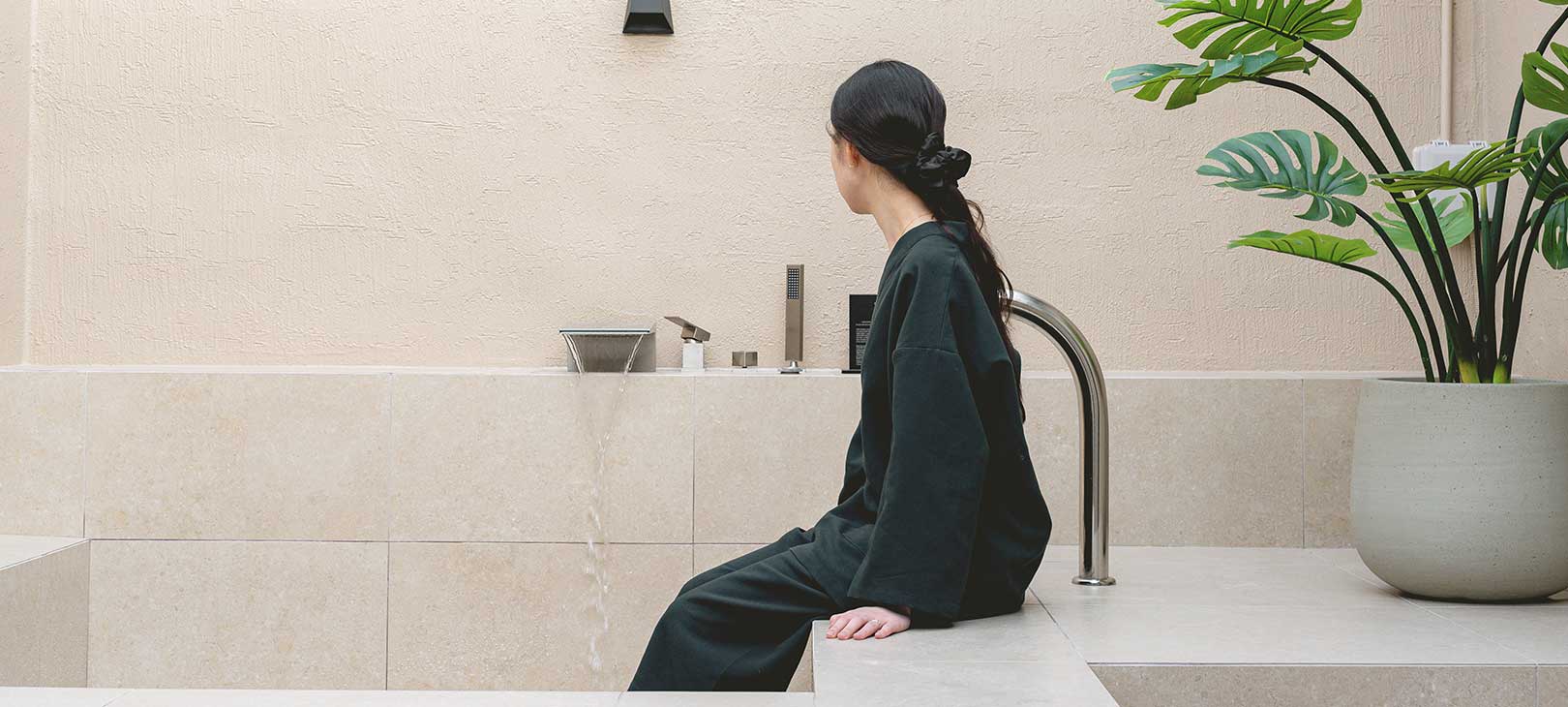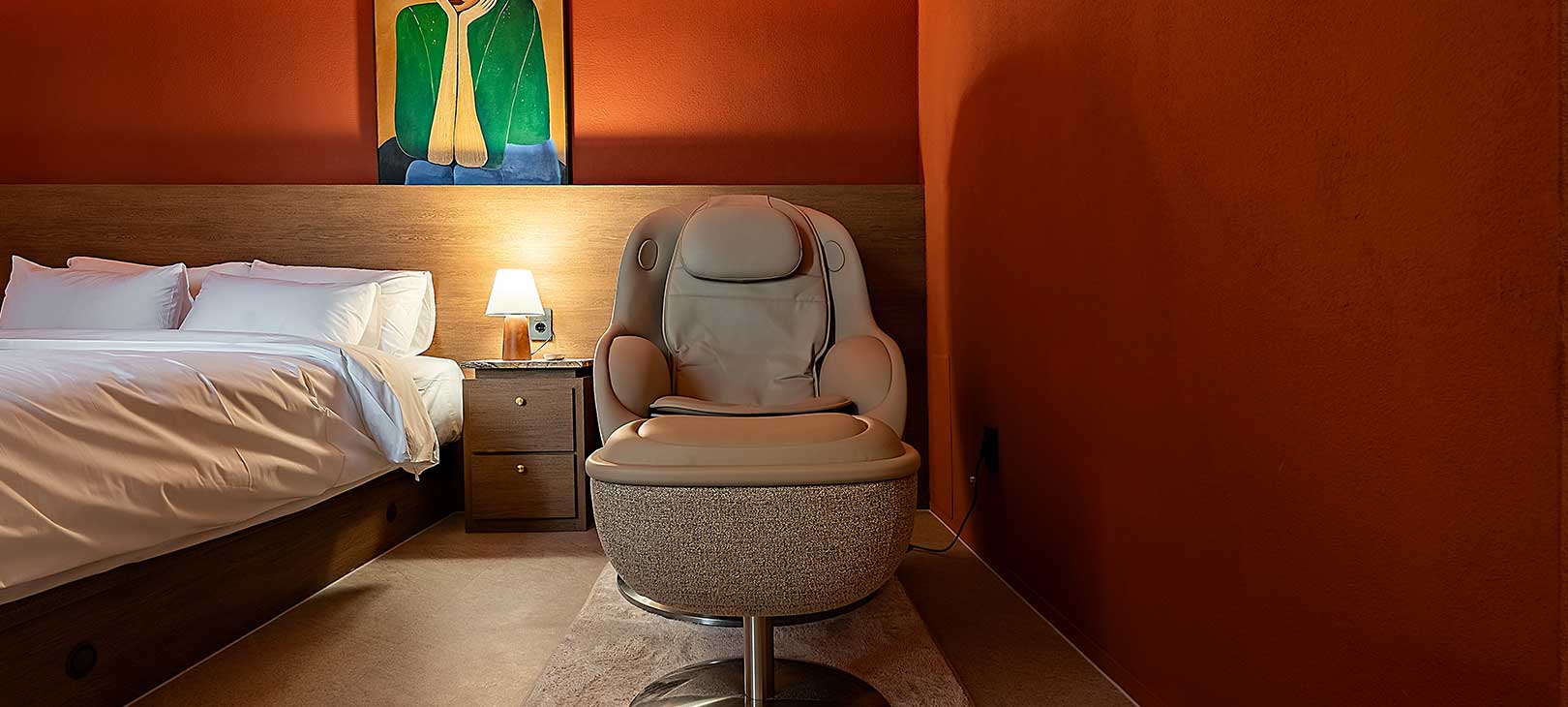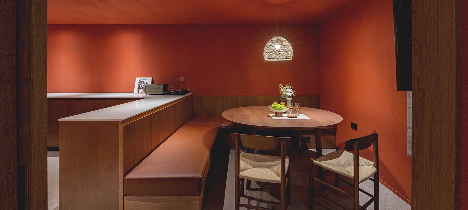붉은 벽돌을 갈아 만든 듯한 마른 장미빛 벽이 공간을 은은하게 감싸며, 햇살 대신 조명이 온기를 채워 넣습니다.